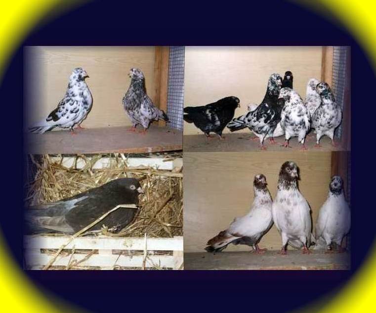 In English this breed is called"Parlor Rollers" , in German "Indische Bodenpurzler" and in Arabic "Shalabaz Hindi". The Parlor Rollers descends from India and Persia and it is a very old breed. In 1596 they were already known in India. In 1855 they were bred for the first time in Scotland. Then the breed came to the USA. This breed cannot fly, they only tumble on the floor. This breed is tame and peaceful and they are happy pigeons, although they cannot fly. They breed very good. This breed is suitable for people whom don't have enough space for a loft, because they don't need a big pigeonry, they can be kept without a lot of space too. It is important that the nests are on the floor or not higher then about 20 - 30 centimeters, because they cannot fly high. It is important that the floor in the loft is soft (for example sand ).
